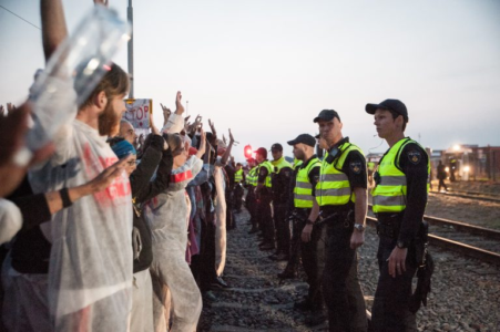 “Zij staan hier evengoed voor de veiligheid van Groningers”, zei ik al minder overtuigd nadat er vier actievoerders waren opgepakt ‘op verdenking van een gestolen fiets’, die niet gestolen bleek. ‘Reguliere controle van papieren’ bij familieleden van prominente actievoerders uit de regio, hinderlijk gebabbel vanuit stapvoets-rijdende politiebusje wanneer je een eindje ging fietsen, de aanwezigheid van politiepaarden, -honden en arrestatieteams vanuit de Randstad en vooral de harde Haagse koppen van de slechtvermomde agenten in burger die op het actieterrein bleven filmen, maakten dat ik tijdens de blokkade het geloof in hun geweldloosheid opgaf. “De lokale politie is maandenlang bang gemaakt”, vertelde een omwonende die zelf contacten heeft in het korps van Delfzijl. Toen een Groningse bekende van me, kapotgetreiterd door de NAM, meermaals zonder aanleiding werd gepord en geduwd door de politie en toen uniformpjes “zo die hebben er zin in” lachten over hun luid blaffende honden, wist ik dat we werden uitgelokt.