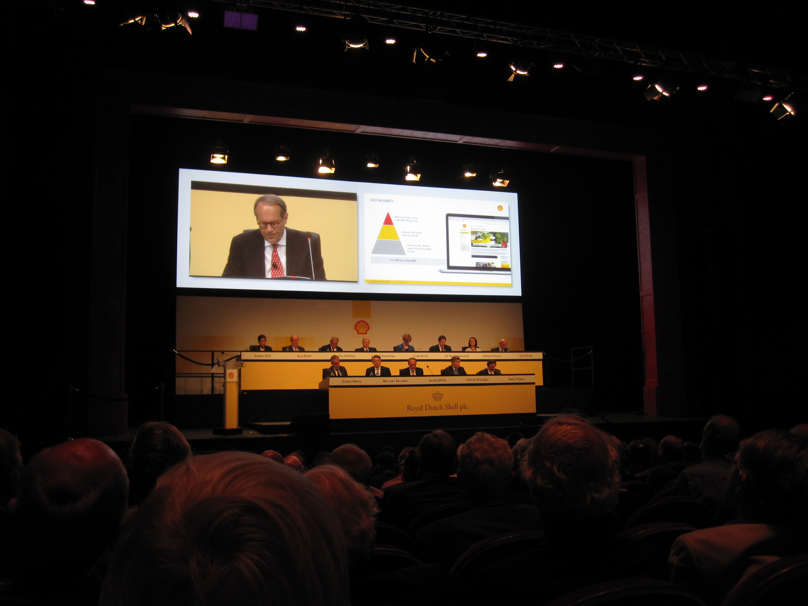 Sadly what we can only conclude after listening to Mr. van Beurden today, is that despite the rheteric in Shell’s 2014 Sustainability Report and at times at the AGM, Shell management is using scenarios in its business planning that assume catastrophic global warming and is not putting serious money into renewables in the near future. Thus, if the institutional investors such as ABP pension fund are looking for clear answers to Shell’s leadership in the energy transition, they will be sorely disappointed. They also should continue to worry about the financial risks of their staying with Shell. To us, this dialogue today reinforces the reason for why we will continue to press Dutch pension funds to divest.