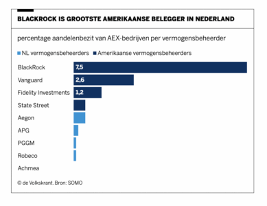 Uit onderzoek van SOMO blijkt dat de vier grootste Amerikaanse vermogensbeheerders BlackRock, State Street, Vanguard en Fidelity maar liefst 12 procent van de Nederlandse markt in handen hebben. Ter vergelijking: de vijf grootste Nederlandse vermogensbeheerders beheren samen slechts 0,9 procent. BlackRock steekt er met kop en schouders bovenuit en is de grootste aandeelhouder in bedrijven als ING, Ahold Delhaize en ASML.