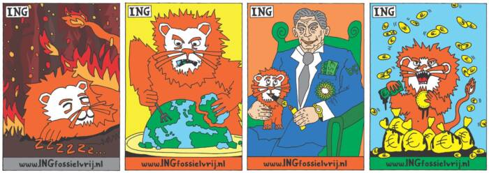Dat ze het zó slecht doen, weten veel mensen waarschijnlijk niet. ING heeft een budget van honderden miljoenen euro’s om hun groene marketing de wereld in te slingeren. Samen kunnen we het beeld van de groene leeuw laten kantelen, en de druk zo hoog opvoeren dat ING stopt met het financieren van alle olie en gas. Stap voor stap, sticker voor sticker.