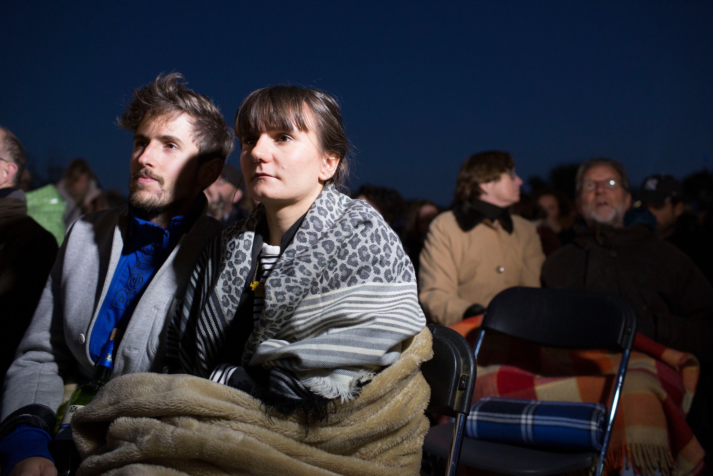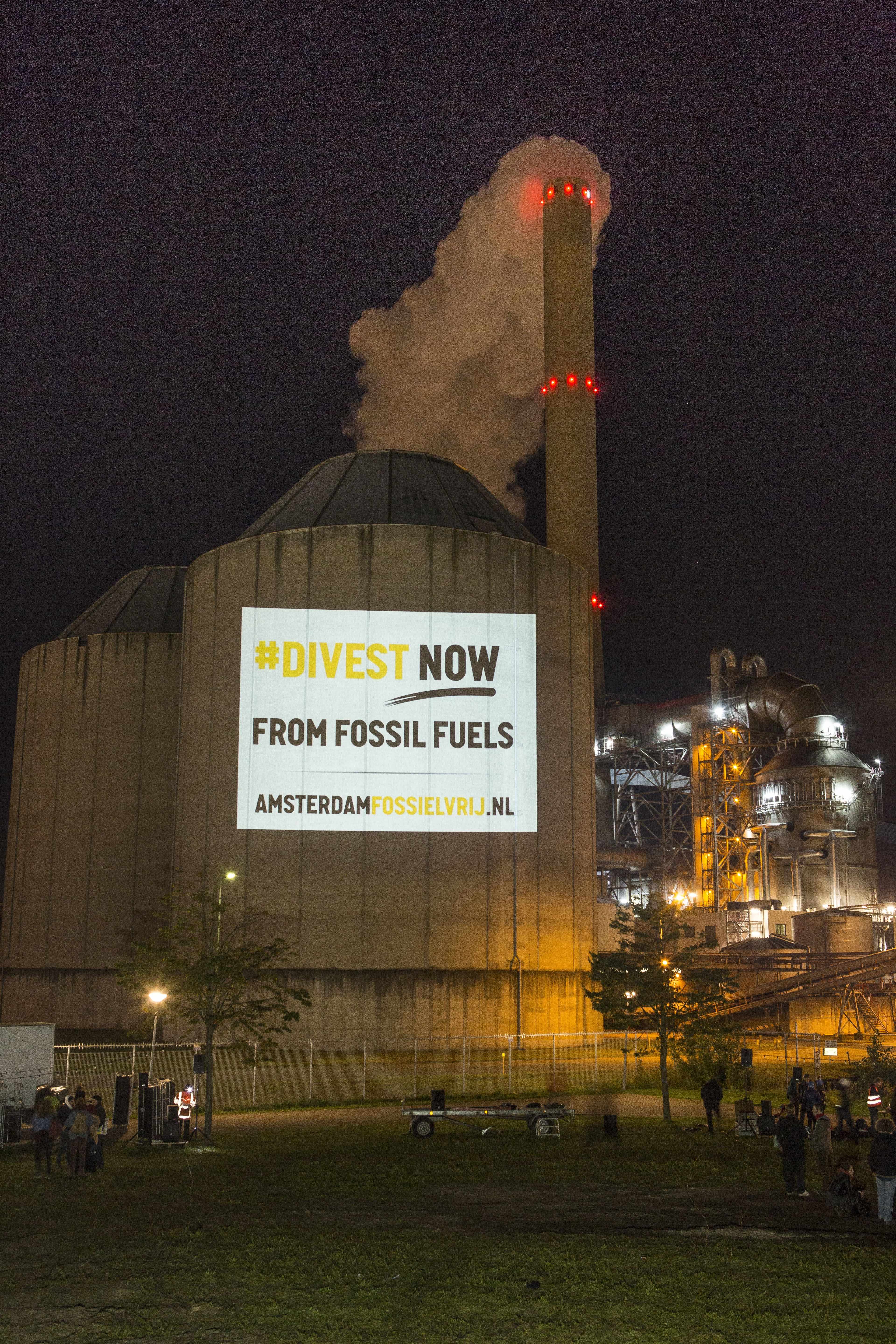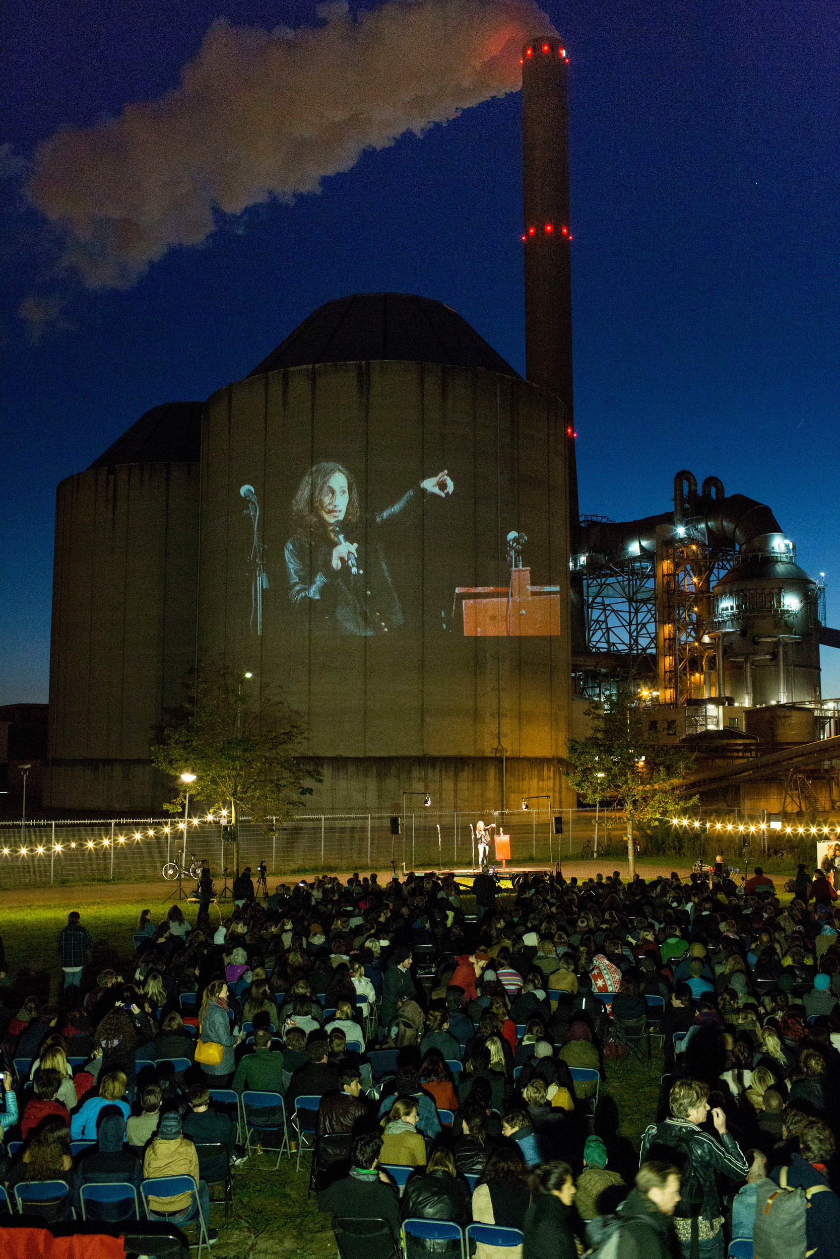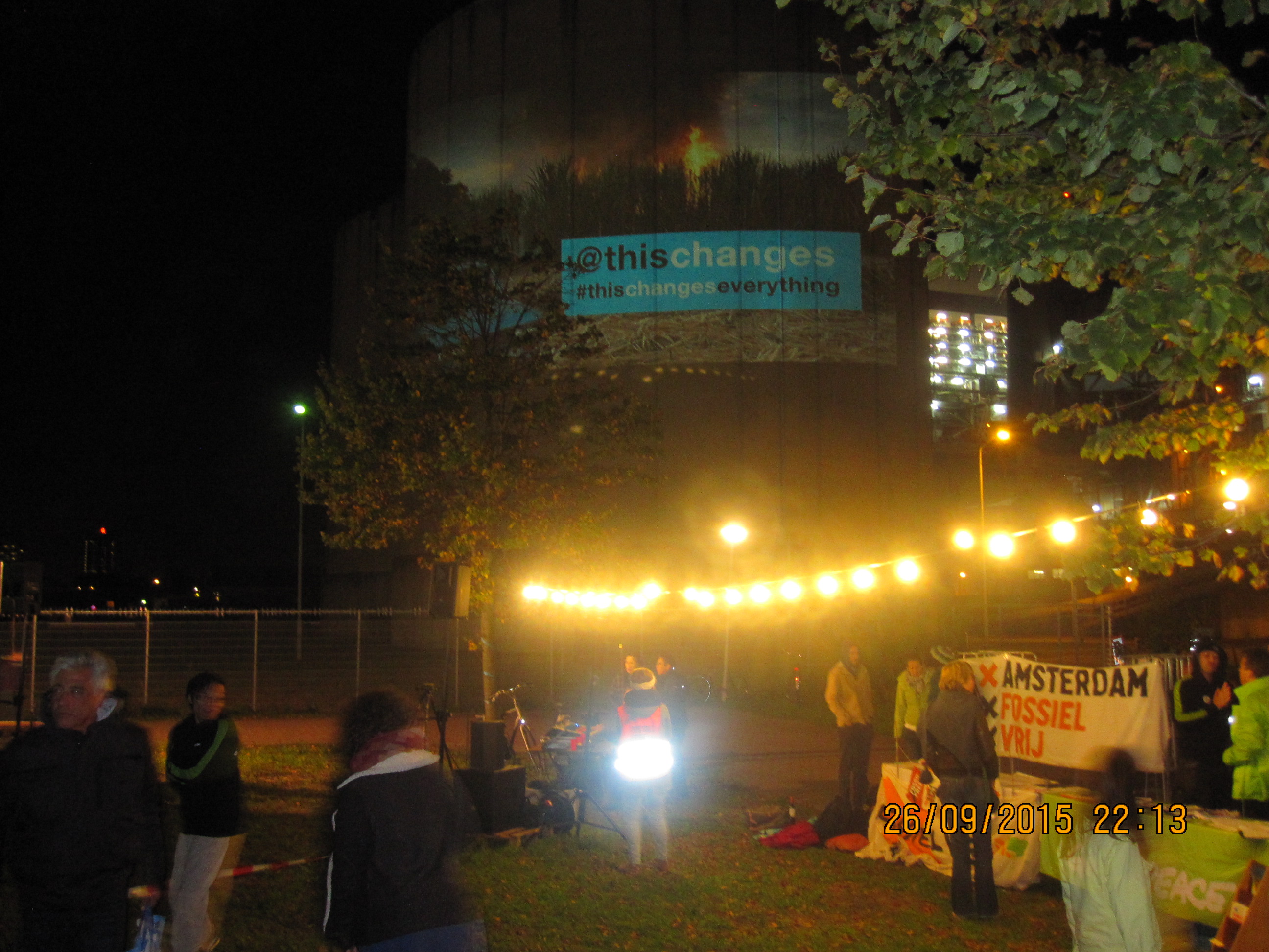 Maar terwijl de hemel van licht- naar donkerblauw verkleurd, de sterren aan het firmament hun licht ontsteken, de maan boven de stad rijst en de pijp onverstoorbaar haar CO2 uitstoot, loopt het veldje langzaamaan vol. En voller. En nòg voller. En tegen een uur of acht zijn de 500 stoeltjes allemaal bezet en beginnen mensen ook op kleedjes op de grond plaats te nemen. Tijdens het voorprogramma muziek met op het boek van Naomi Klein geïnspireerde teksten, de keuken van Rampenplan draait al lekker, de sfeer is goed. Mensen hebben er zin in, ik ook. We hebben leuke gesprekken met mensen die willen weten over het hoe, wat en waarom van Fossielvrij, ze tekenen onze contactlijst; weer nieuwe petitietekenaars! Maar dat is niet de echte reden van onze komst.