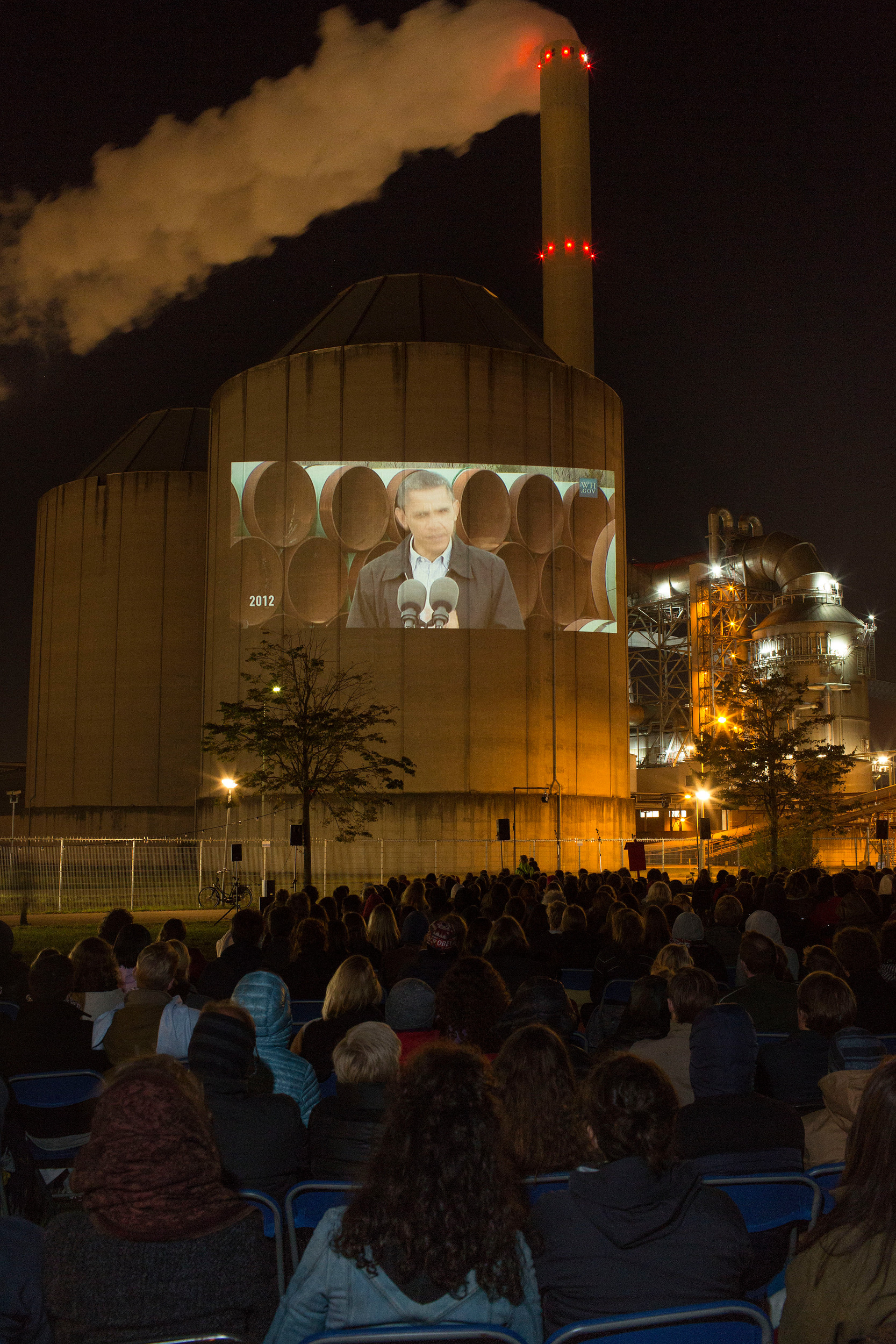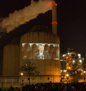 Ondanks dat de ‘Wolkenfabriek’ (lees: kolencentrale) van heinde en verre zichtbaar is, is het een sportieve aangelegenheid om het braakliggend terrein noordelijk van de NUON Power Generation BV, vanavond onze openluchtbioscoop, te bereiken. Zowel te voet als per fiets. En omdat we een klimaatdocumentaire gaan vertonen, samen met Milieudefensie en Greenpeace, vrees ik even of er wel meer dan 150 mensen zullen komen. De toezeggingen op het facebookevent logen er niet om; ca 1700 gaven aan te willen komen.