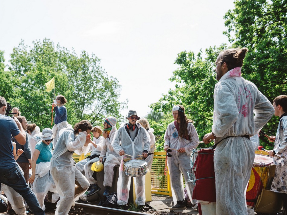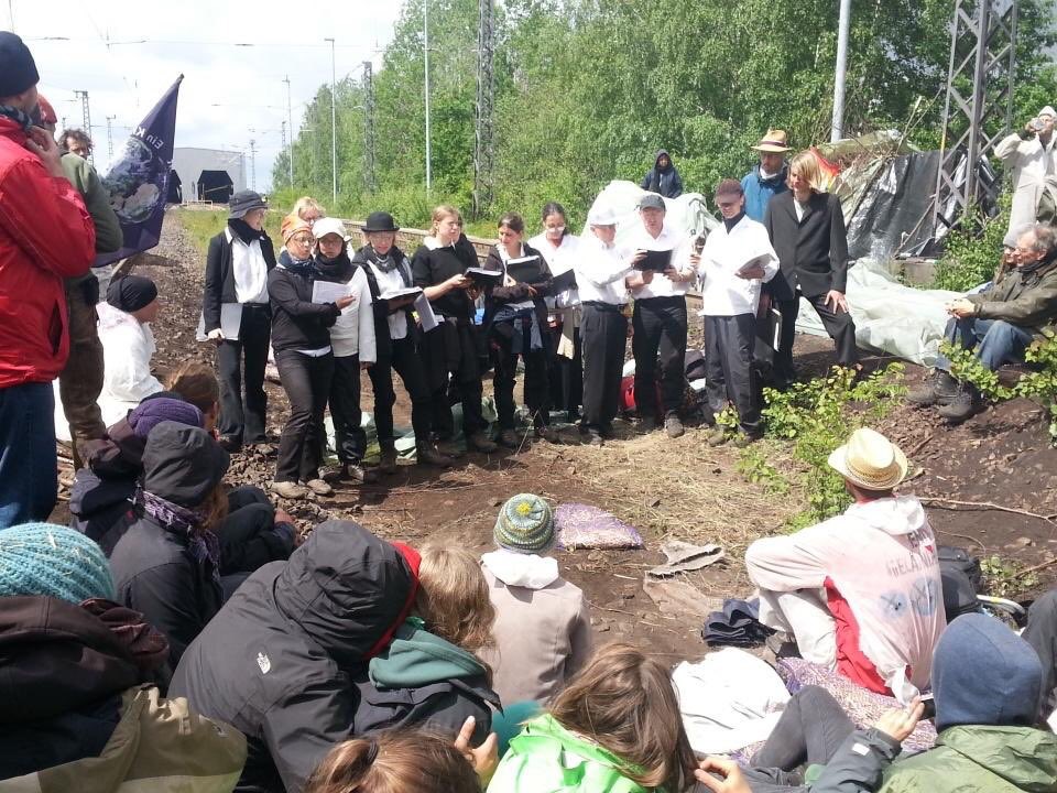 We stayed on for a bit in the blockade. An orchestra / choir showed up and even though we were really tired we enjoyed ourselves. In the end it was decided we would leave as a group to join the orange group at the other blockade on the railbridge. Fastest way to get there would be to walk down the tracks past the power plant. But Team Blue didn’t agree with that and wanted to play a little game of tag instead.