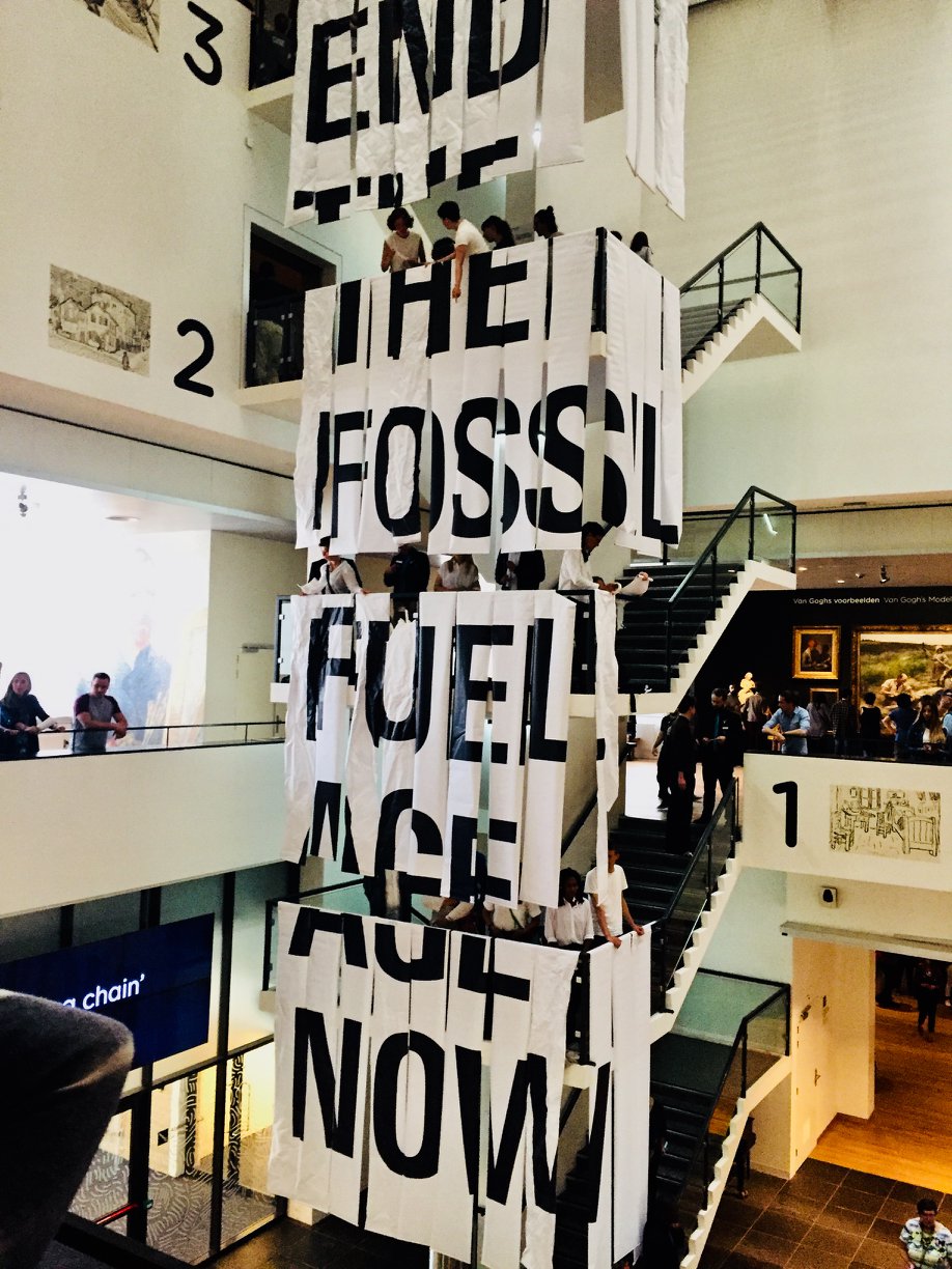 Performers van Fossil Free Culture NL vragen het Van Gogh Museum de relatie met Shell te verbreken en het tijdperk van fossiele brandstoffen te beëindigen.