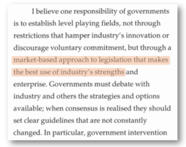 “I believe one responsibility of governments is to establish level playing fields, not through restrictions that hamper industry’s innovation or discourage voluntary commitment” (Shell, 1992)
