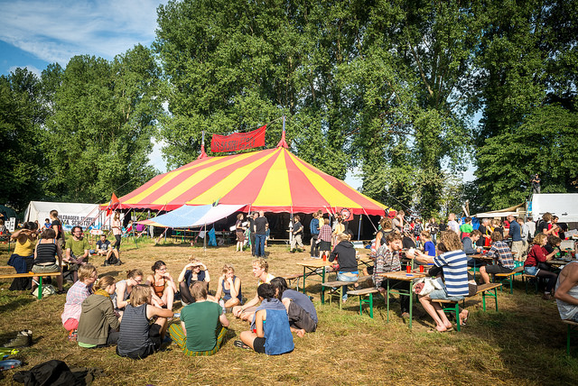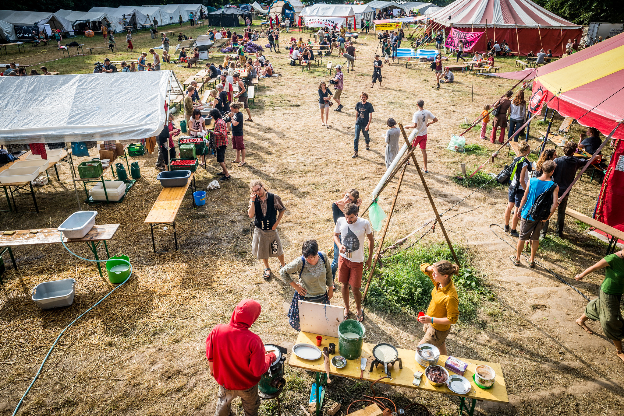 Toch voelde het niet gek dat ik daarbij zat. Toen we eerder die week aankwamen op het kampterrein – een stuk gras dat een lokale boer tijdelijk aan de organisatie had afgestaan – verbaasde me de strakke organisatie en de gezellige festivalsfeer. Natuurlijk, er liepen zeer diverse mensen rond, de toiletten werkten met zaagsel in plaats van water en al het eten was veganistisch (dat overigens dagelijks door een fantastisch team van Nederlandse vrijwilligers voor alle aanwezigen werd bereid!). Maar mijn angst te belanden in een kamp met enkel hippies en anarchisten waar mijn hipstervogelshirt en Nikes totaal uit de toon zouden slaan bleek volkomen onterecht.