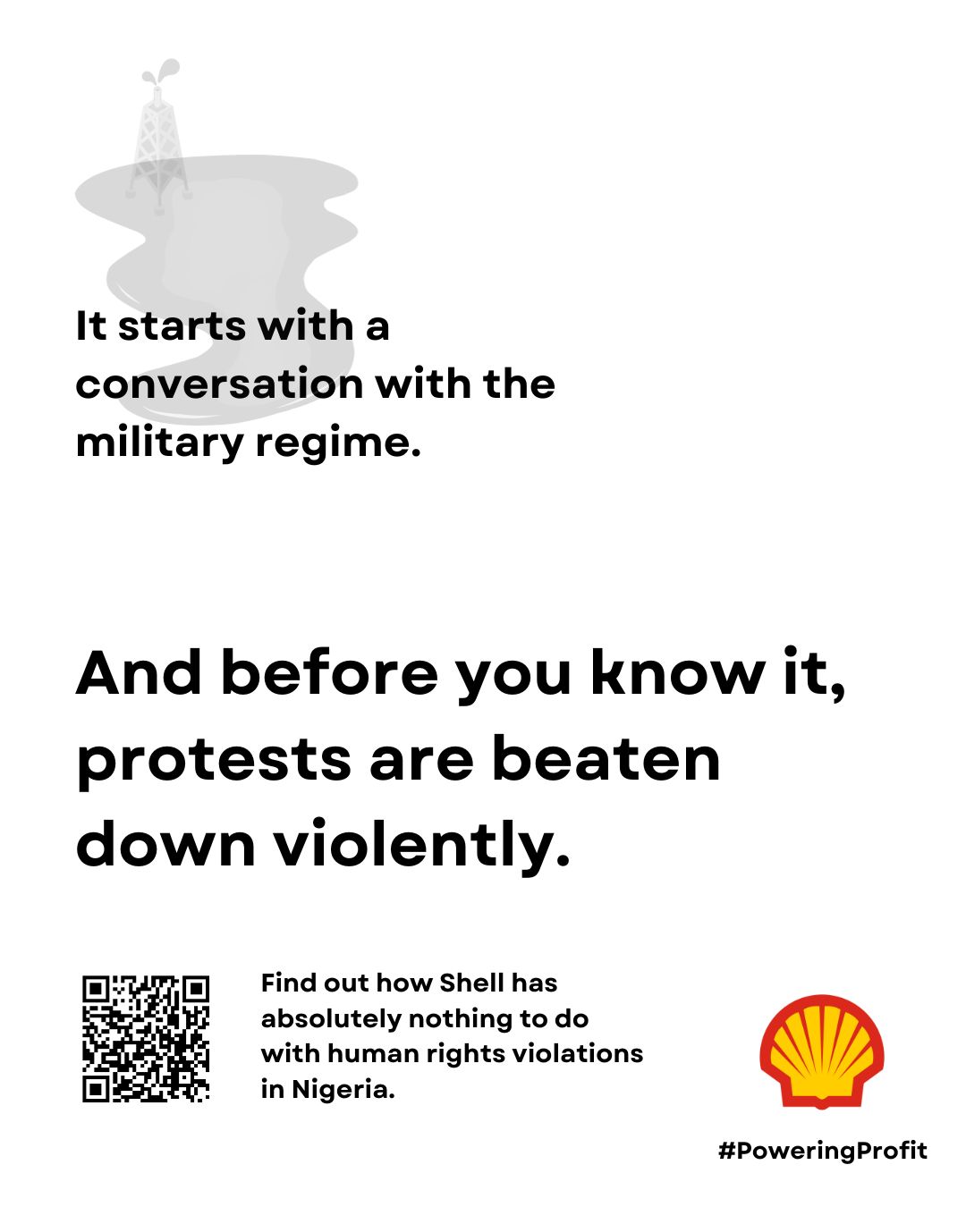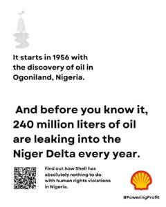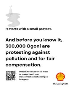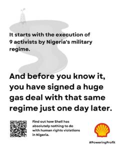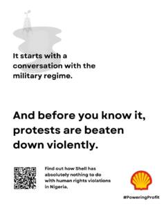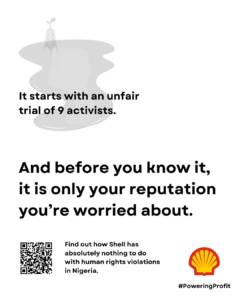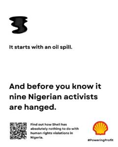 Shell claimed that this particular poster was misleading, saying that we accused Shell of murder. We obviously never said Shell single-handedly killed the nine activists in Nigeria. We did say however – and we are repeating this statement again today – that Shell played a harmful role in the circumstances surrounding the executions and human rights violations in Nigeria. Our new poster series puts a spotlight on this.
