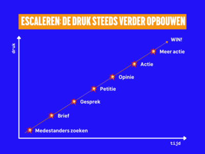 Wij hebben een toolkit gemaakt waarmee je direct zelf aan de slag kunt. Het stappenplan en de volgorde kun je aan je eigen campagne aanpassen. Het is vaak logisch om laagdrempelig te beginnen (denk aan een brief of een gesprek). Als dat niet genoeg oplevert, kun je verder ‘escaleren’ door de publiciteit te zoeken met een petitie, social media-account, opiniestuk of demonstratie.