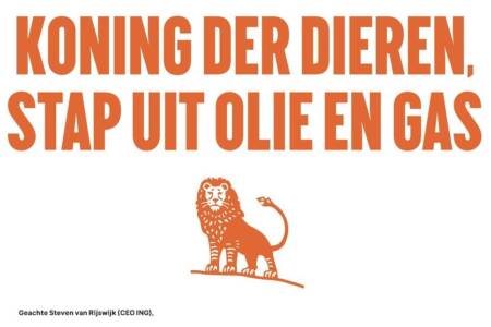 FNV, Cordaid, Both Ends en nog 23 andere zakelijke klanten maken samen een vuist tegen ING. In een paginagrote advertentie in de Volkskrant roepen ze ING als ‘koning der dieren’op om uit olie en gas te stappen.