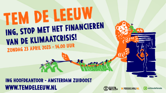 Op zondag 23 april, één dag voor de aandeelhoudersvergadering, gaan we met meer dan duizend mensen naar het hol van de leeuw. Met een grote manifestatie bepalen wij de agenda: ING moet stoppen met het financieren van olie, kolen en gas.
